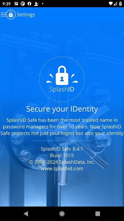 Please open the SplashID Safe 8.4.x app on your Android device, then invoke the menu (by tapping the Android device Menu button) or by tapping the menu/Hamburger icon (three lines icon) in top left. Then tap Settings and tap About SplashID -->