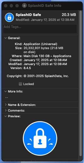 * OR, to check it from Mac OS Finder, use the Get Info function over the SplashID Safe app icon in Applications folder. Namely, right click or Ctrl+click the app icon, then choose Get Info from the popup menu -->