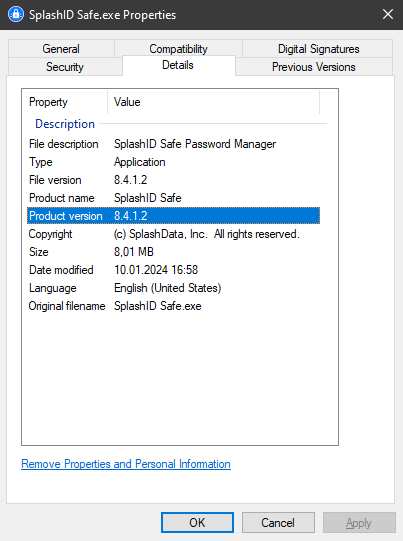 the SplashID Safe.exe Application file located there, then choose Properties from the popup menu. Then click the Details tab to see the exact version number under File version and/or Product version: