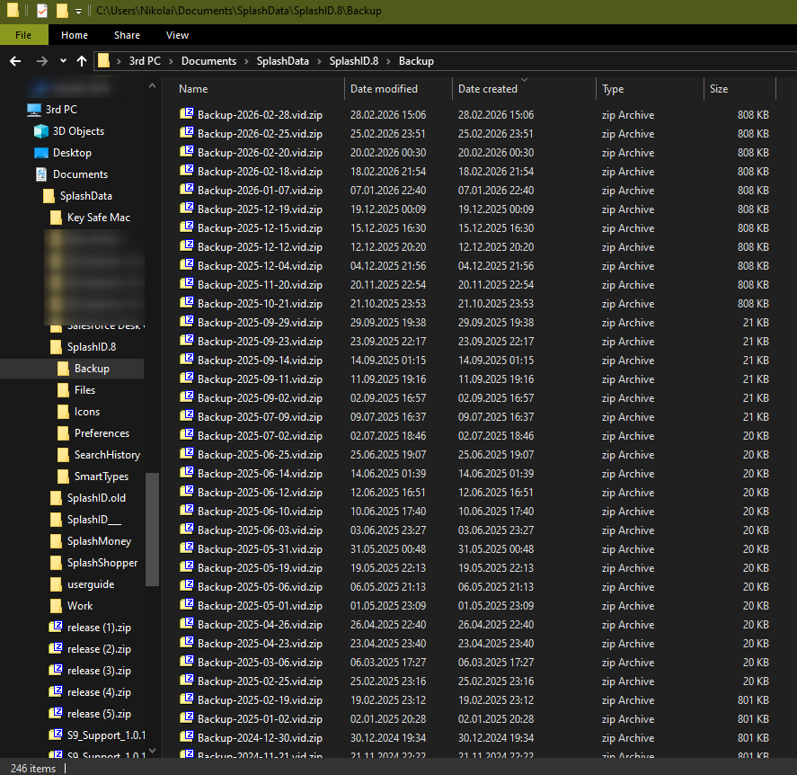 SplashID Safe 8.4.x Desktop apps (PC and Mac) support both automatic and manual backups. The available options may vary depending on the app version, platform, and sync mode used (No Sync, WiFi Sync, or Cloud Sync).